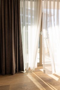 A cortina de voil, sozinha, não protege. Filtra a luz de forma difusa, cria privacidade diurna sem escurecer o ambiente — e só. Para ambientes que precisam de vedação noturna ou proteção UV efetiva, ela precisa de uma camada funcional por trás.